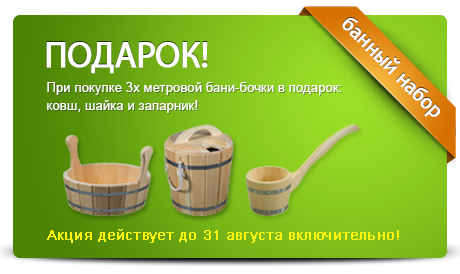 До 31 августа, при покупке 3х метровой бани-бочки в подарок: ковш, шайка и запарник!