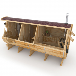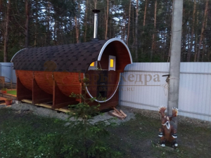 Это изделие круглой вытянутой формы. Козырек не только украшает баню, но и защищает оставленную обувь от дождя. Лавочки из кедра находятся по всей длине бани-бочки с обеих сторон. Печь расположена в парилке около дальней стены. Время растопки такой печи не превышает 30 минут. В зависимости от выбранного размера круглая баня-бочка с козырьком имеет следующую комплектацию: