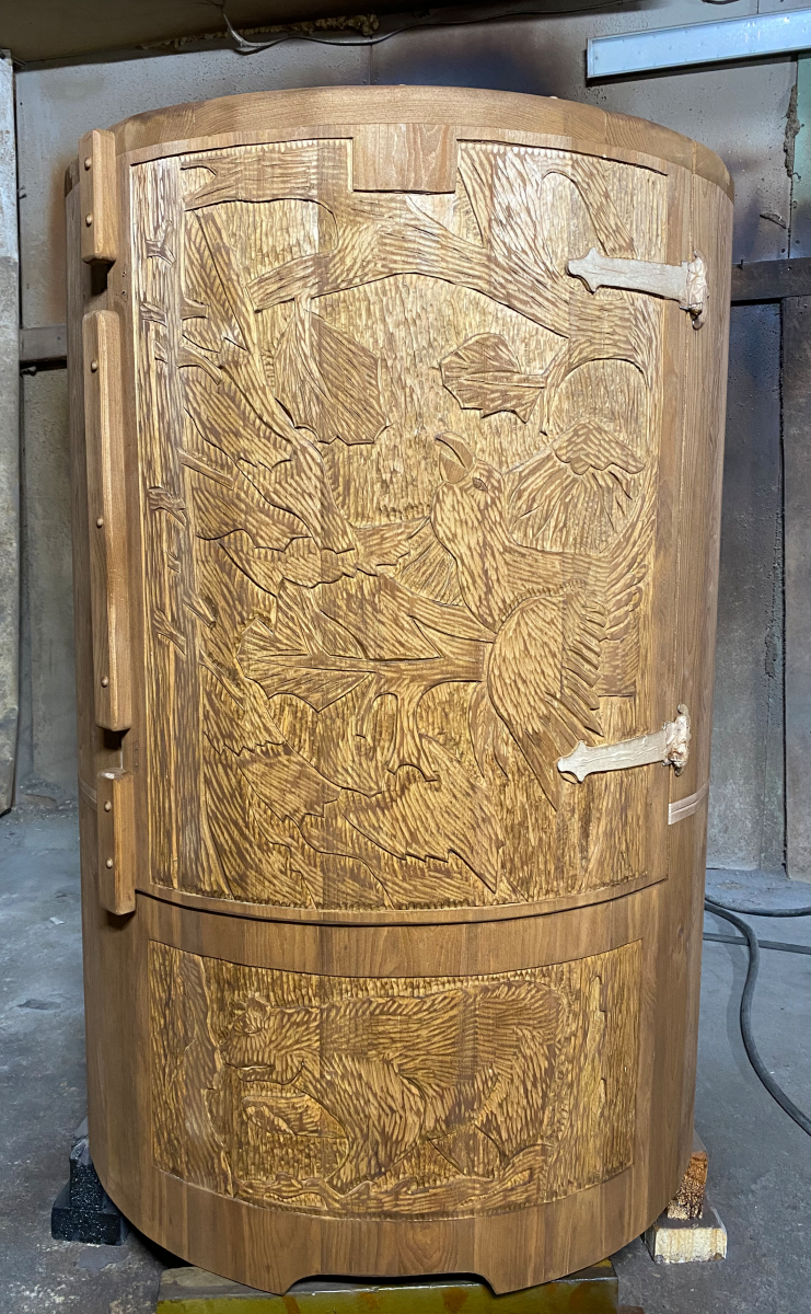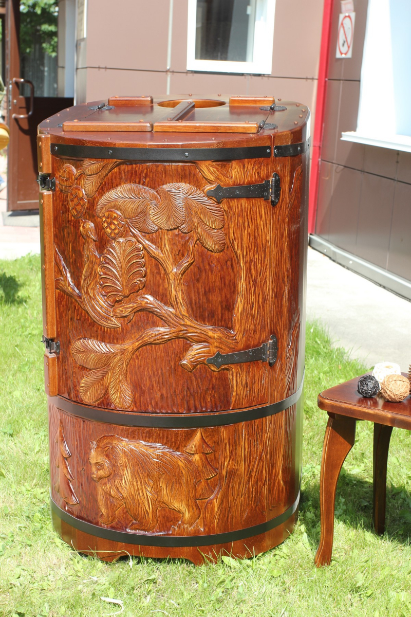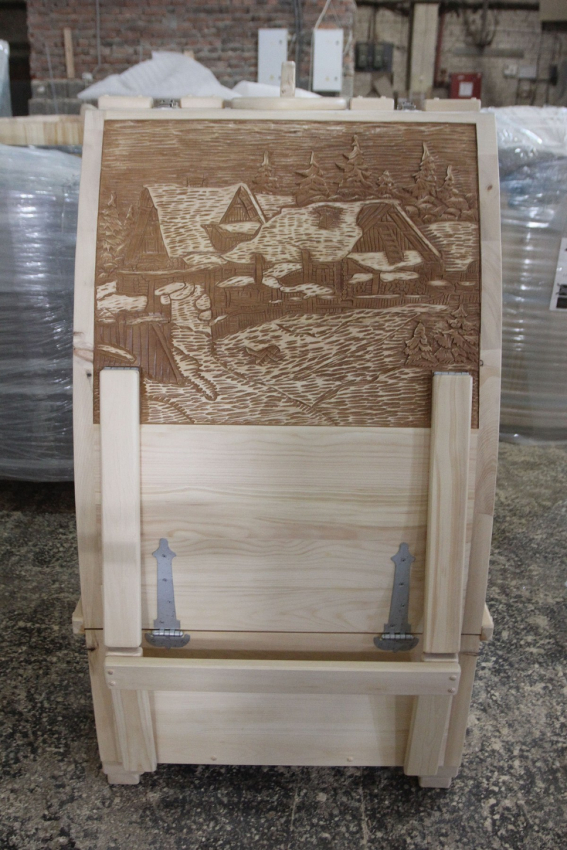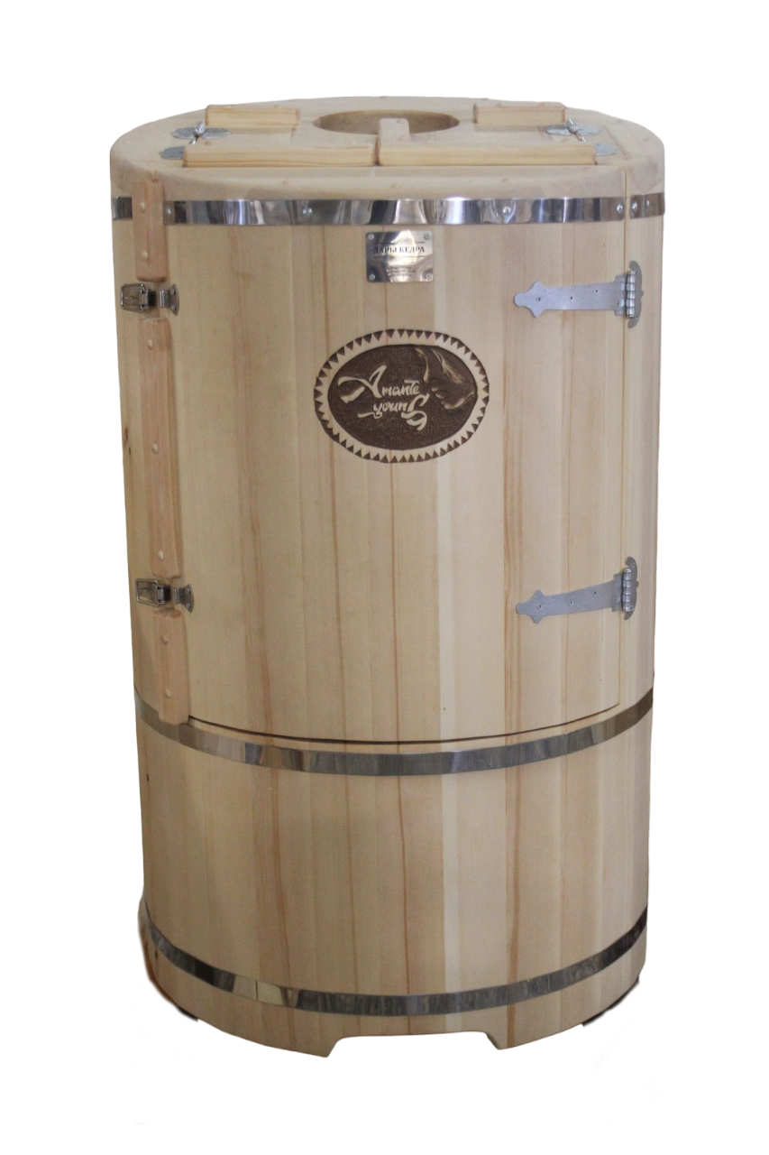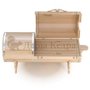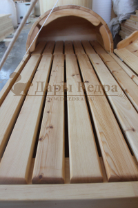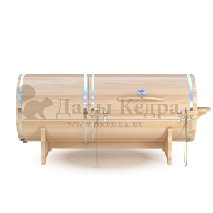 Фитобочка горизонтальная из кедра наиболее комфортна в использовании, потому что во время процедур человек принимает лежачее положение. Она оснащена откидной дверцей, которая во время открывания хорошо держится за счет джутовых веревок. Внутренняя ручка из кедра облегчает открывание и закрывании двери во время использования. Такая модель подходит для оздоровительных центров.